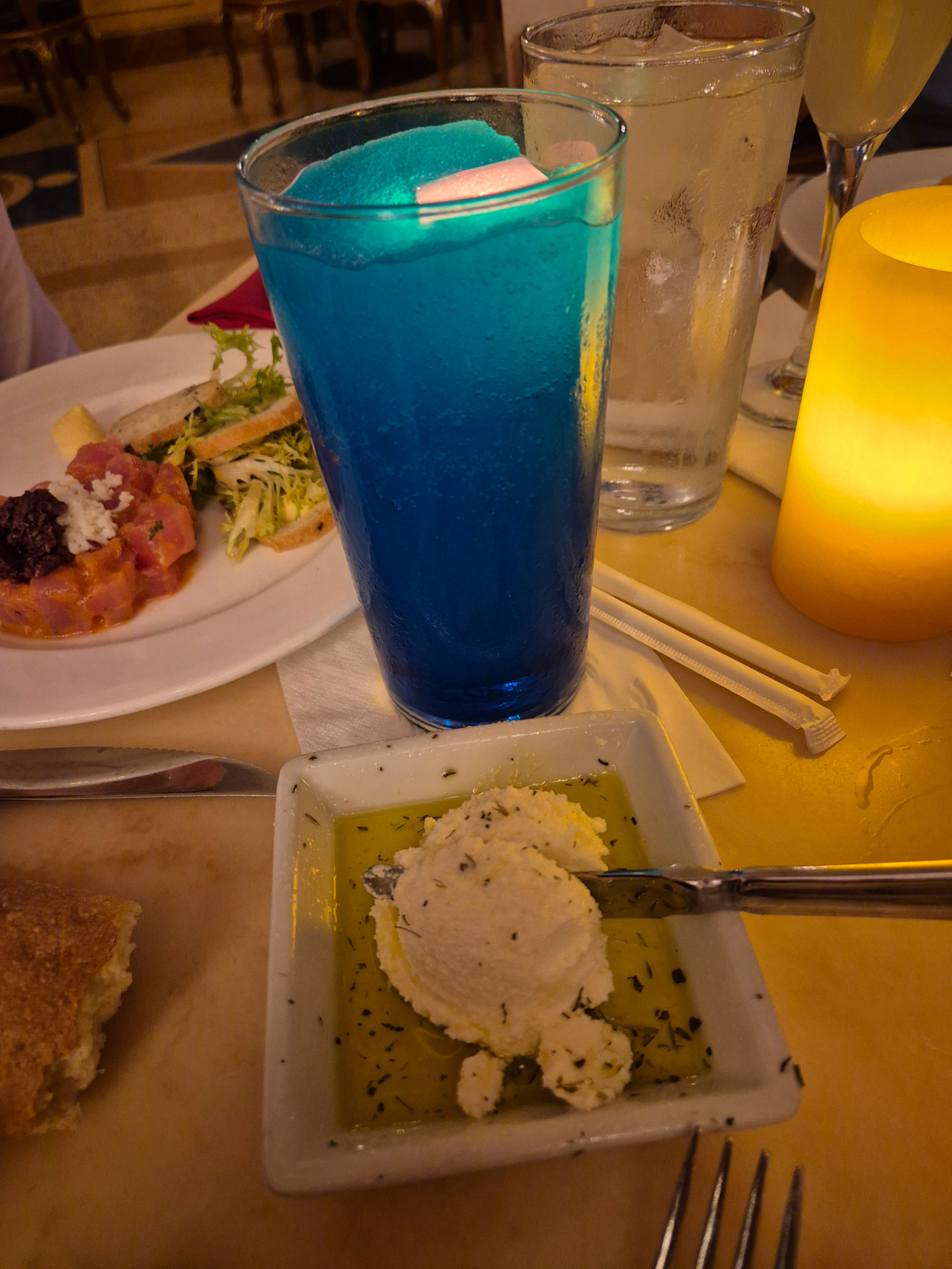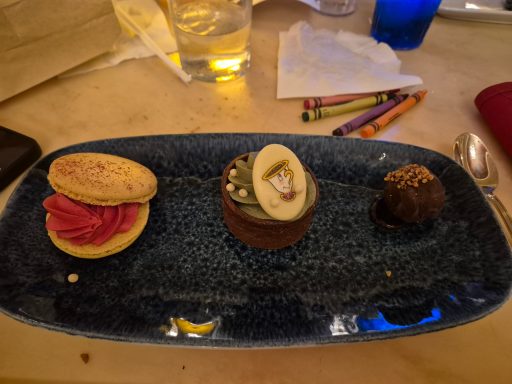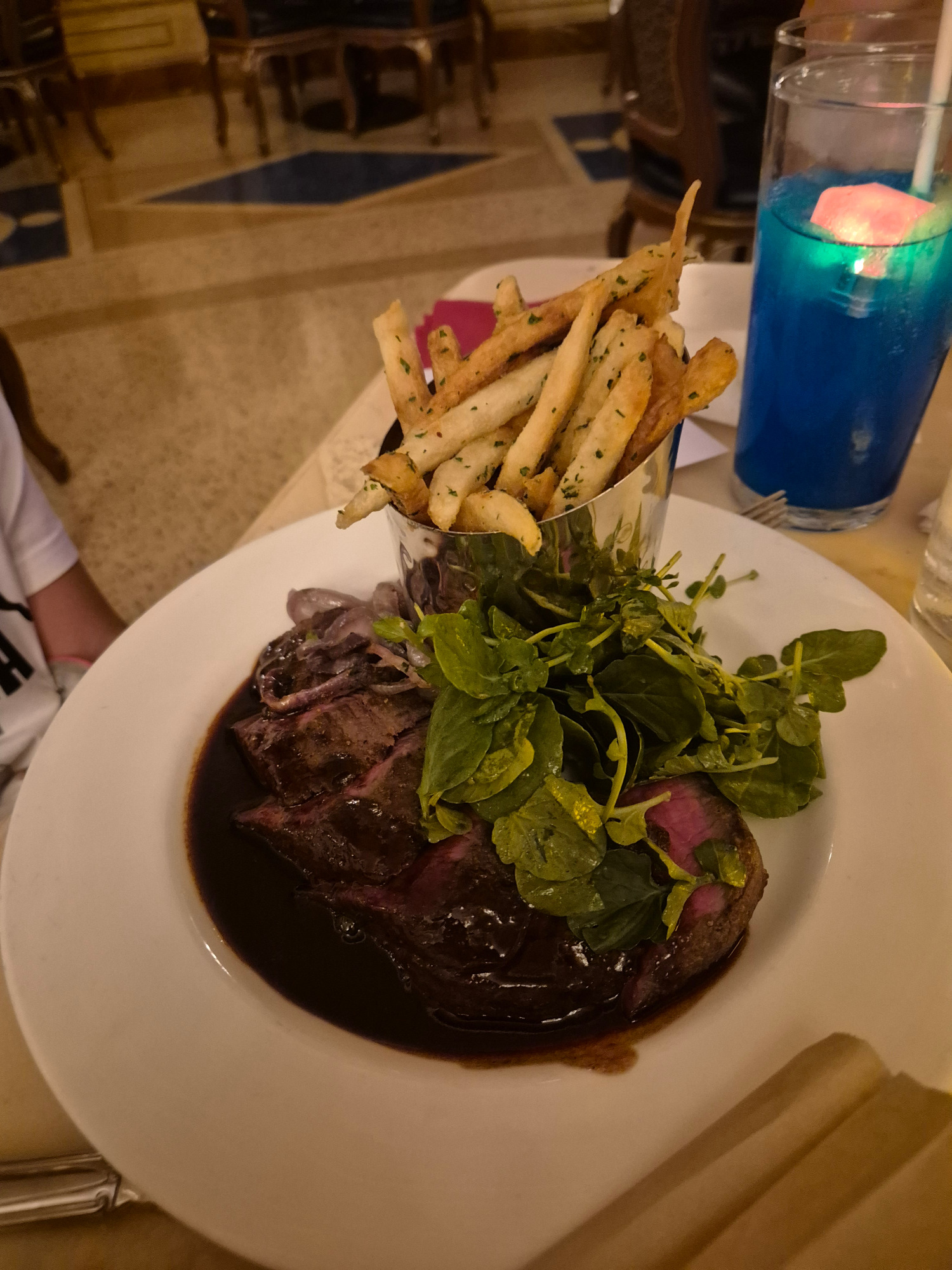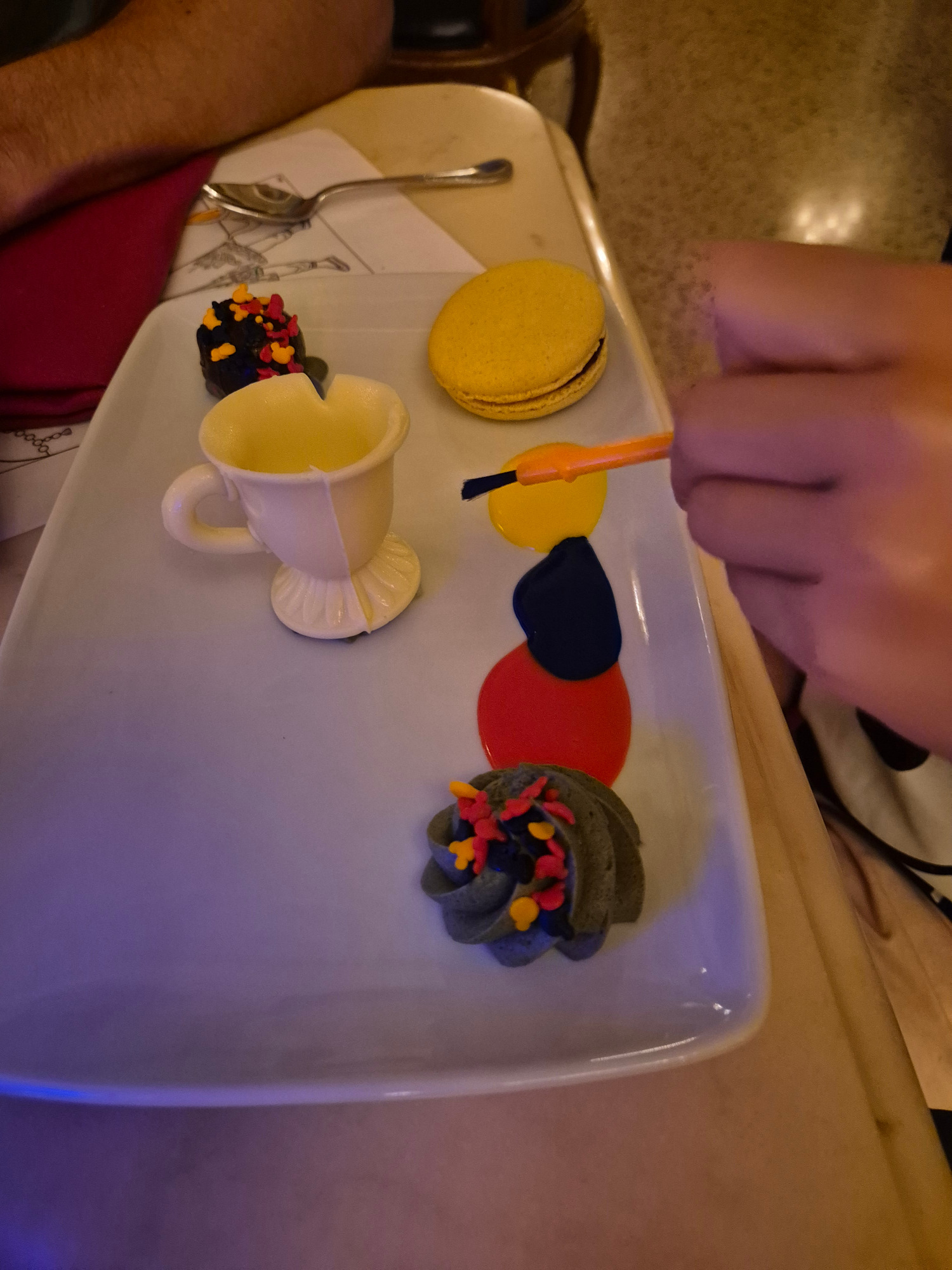 Après avoir brillé, admiré, il est temps de manger car on est quand même venu pour ça ! On commence avec l'apéro ! On a droit à 1 boisson (alcoolisée ou pas) avec le dining plan. On choisit notre cocktail qui est très bon. Notre filla a eu un glaçon LED clignotant et changeant de couleurs !!! Elle a adoré ! Les enfants ont eu des feuilles de jeux pour s'occuper, ce qui n'est pas négligeable. Nous avons également du pain et du beurre. Ce n'est pas la même chose qu'en France, le goût des 2 est différent. Nous aurons la réponse à cela au resto du Chef de France à Epcot, vous l'aurez aussi ! Il est temps de commander nos appetizers (les entrées) et notre plat (nommé entrées aux USA). Attention, ne vous trompez pas ! J'ai choisi la soupe à 'l’oignon, mon mari et mon fils un tartare de saumon et ma fille (menu enfant) des fruits. Pour le plat, avec mon fils on a pris un bœuf bourguignon, ma fille des mac and cheese (elle avait le choix avec d'autres viandes) et 2 accompagnements et mon mari une pièce de bœuf (Attention !!! ce n'est pas celui où il y a écrit beef !!!). P'tit conseil valable pour tous les restos avec menu : regardez à l'avance les menus. Pourquoi ? Les intitulés peuvent tromper et vous induire en erreur !!! A vérifier, mais il me semble que la pièce de bœuf de mon mari s'appelait filet mignon... Faîtes des p'tites recherches google et sur l'appli Disney expérience si c'est important pour vous ! On l'a fait pour ce resto et pour le Storybook dining, surtout pour les viandes. Pour le dessert, on a eu des mignardises.