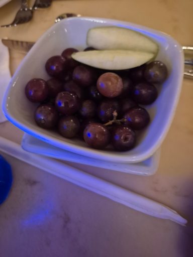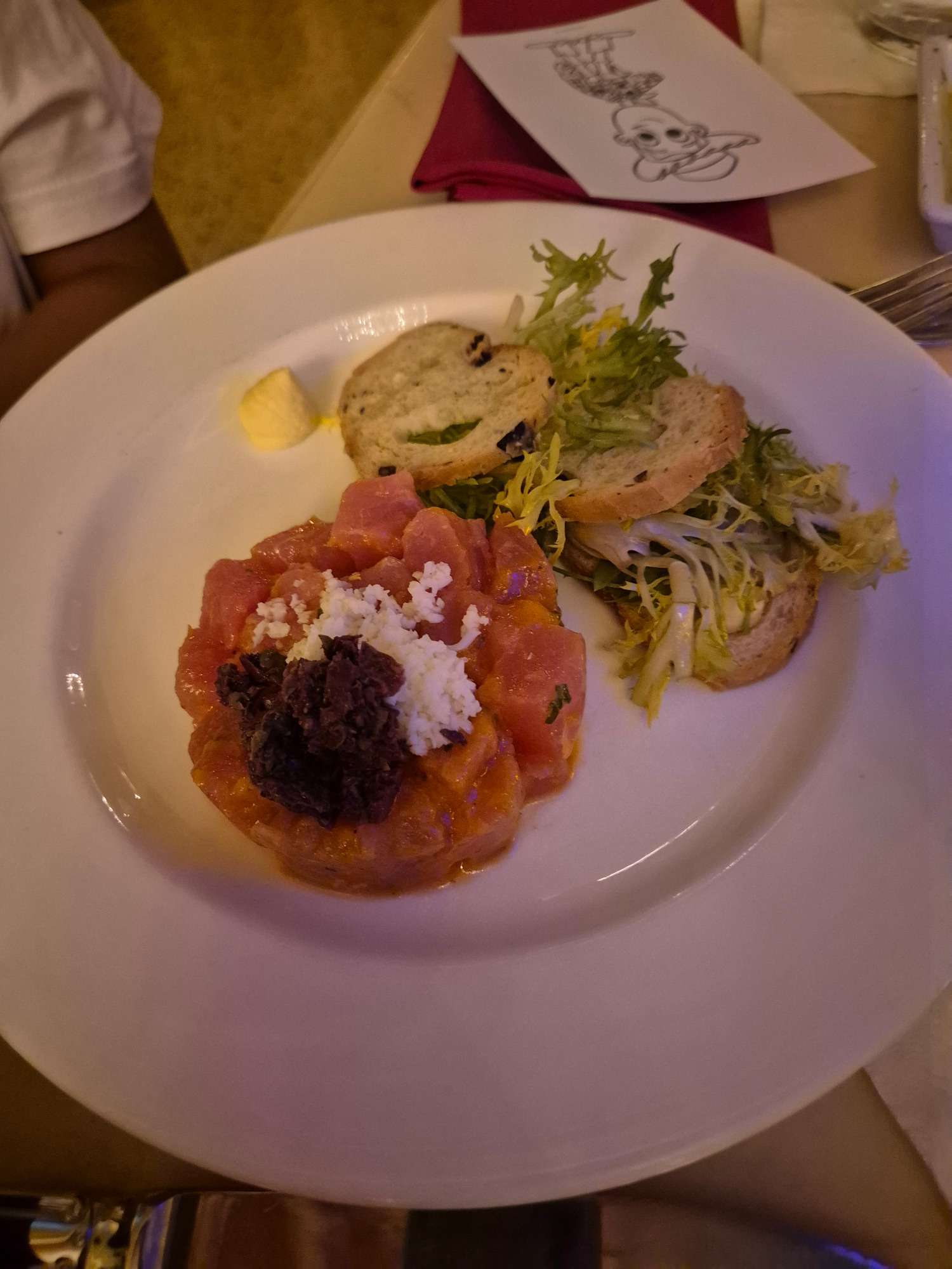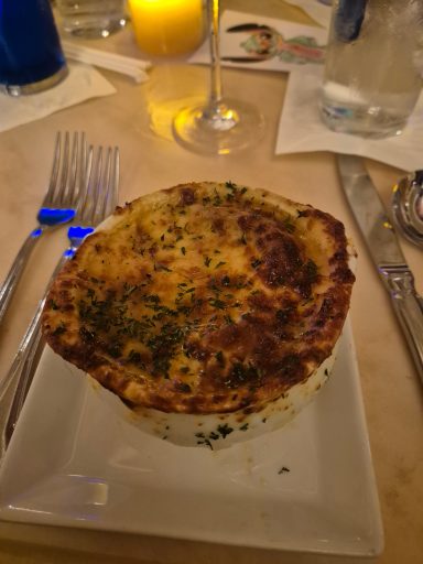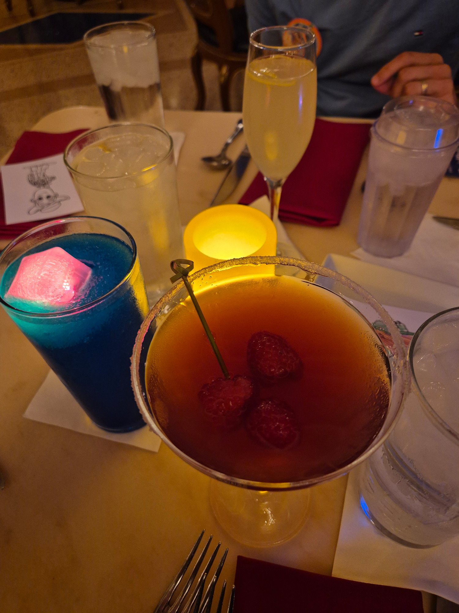 Après avoir brillé, admiré, il est temps de manger car on est quand même venu pour ça ! On commence avec l'apéro ! On a droit à 1 boisson (alcoolisée ou pas) avec le dining plan. On choisit notre cocktail qui est très bon. Notre filla a eu un glaçon LED clignotant et changeant de couleurs !!! Elle a adoré ! Les enfants ont eu des feuilles de jeux pour s'occuper, ce qui n'est pas négligeable. Nous avons également du pain et du beurre. Ce n'est pas la même chose qu'en France, le goût des 2 est différent. Nous aurons la réponse à cela au resto du Chef de France à Epcot, vous l'aurez aussi ! Il est temps de commander nos appetizers (les entrées) et notre plat (nommé entrées aux USA). Attention, ne vous trompez pas ! J'ai choisi la soupe à 'l’oignon, mon mari et mon fils un tartare de saumon et ma fille (menu enfant) des fruits. Pour le plat, avec mon fils on a pris un bœuf bourguignon, ma fille des mac and cheese (elle avait le choix avec d'autres viandes) et 2 accompagnements et mon mari une pièce de bœuf (Attention !!! ce n'est pas celui où il y a écrit beef !!!). P'tit conseil valable pour tous les restos avec menu : regardez à l'avance les menus. Pourquoi ? Les intitulés peuvent tromper et vous induire en erreur !!! A vérifier, mais il me semble que la pièce de bœuf de mon mari s'appelait filet mignon... Faîtes des p'tites recherches google et sur l'appli Disney expérience si c'est important pour vous ! On l'a fait pour ce resto et pour le Storybook dining, surtout pour les viandes. Pour le dessert, on a eu des mignardises.