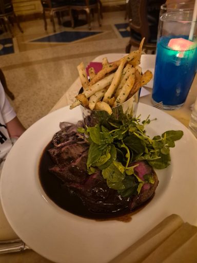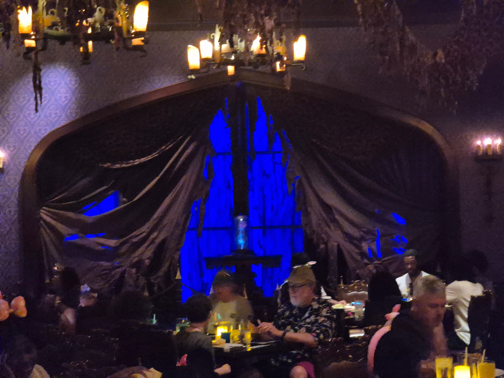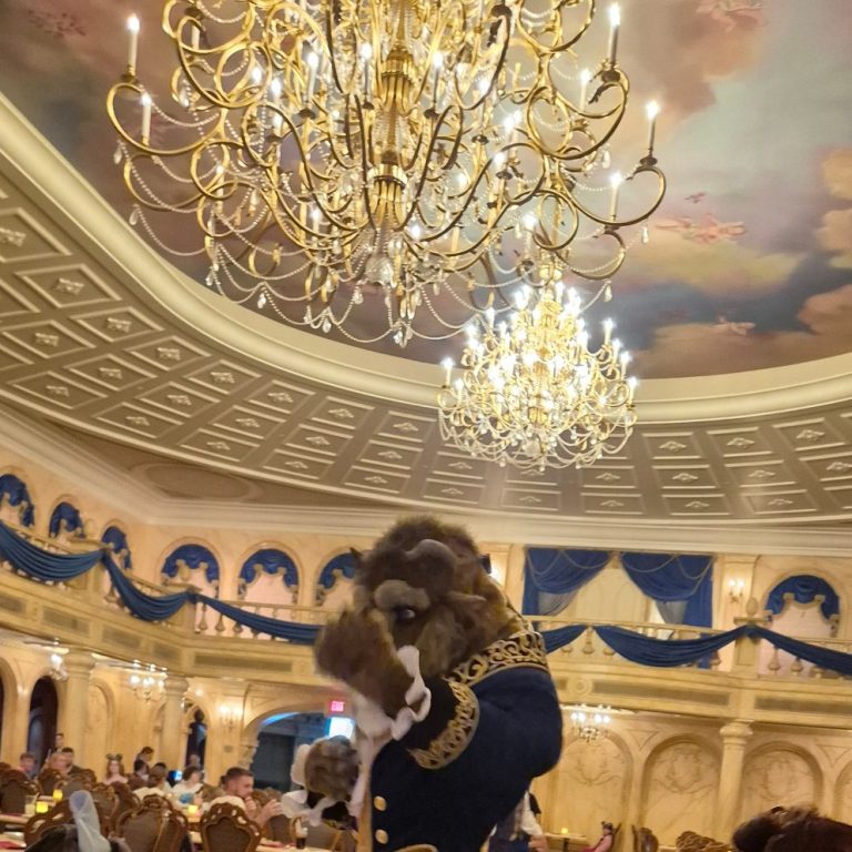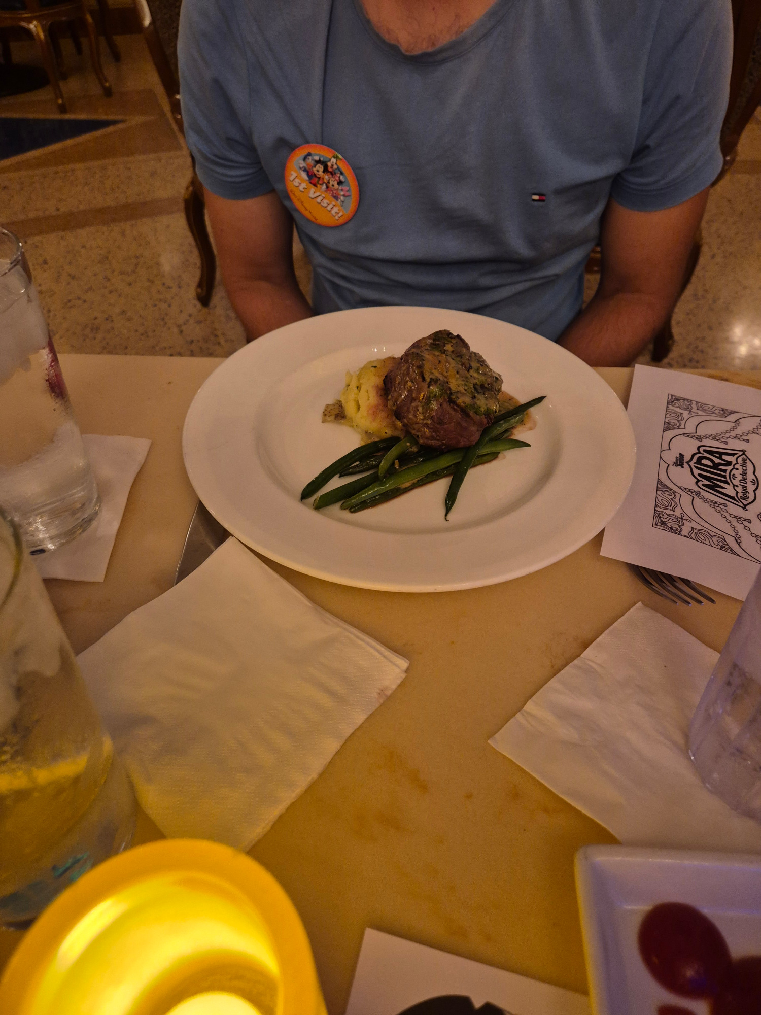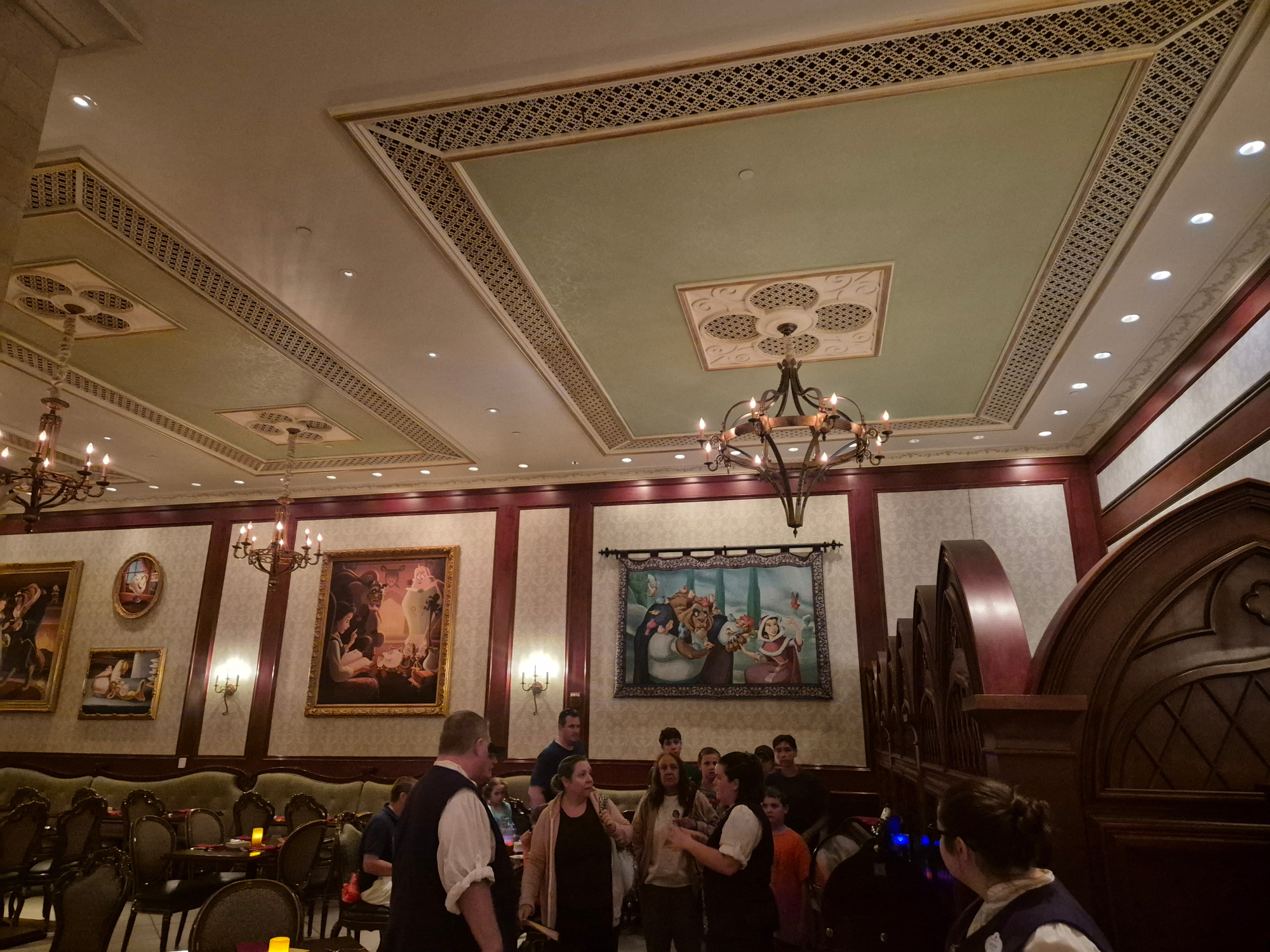 Il est 13h45, le mardi 15 juillet 2025. Nous sommes sur le parc Magic Kingdom depuis 8h et il est l'heure d'honorer notre première réservation de restaurant service à table avec la présence d'un célèbre personnage. L'heure a sonné, il est temps d'aller manger ! On s'approche du château de La Bête ! Quelle entrée !!! Digne d'un château à la française ! Elle est magnifique. J'avais entendu qu'on pouvait attendre 1 heure avant d'entrer, ça n'a pas du tout été notre cas. Le temps de vérifier notre résa et on nous escorte à l'intérieur. On s'y croit, ce moment où l'on entre dans cette salle si connue restera un souvenir impérissable. Les papillons et les frissons sont là ! La musique dans la salle vient nous bercer, l'émotion est là comme Disney sait le faire ! A ce moment là, je me suis dit : "Heureusement qu'on l'a sélectionné ! C'est à voir, c'est une expérience !". Un cast member nous accompagne à notre table. Nous mangerons dans la salle principale, parfait. A savoir : il y a 3 pièces : la salle de bal (la principale et la plus grande), l'aile ouest et une dernière décorée à l'effigie de la belle et la bête. J'ai pu aller voir ces autres salles à la fin du repas, elles sont très jolies également. Mais le coup de cœur reste sur la salle de bal. Les murs étaient des écrans et ils changeaient au cours du repas. P'tits bémols qui peuvent déranger : la salle est très grande, il peut y avoir beaucoup de monde. Elle peut donc être bruyante. Ça n'a pas été notre cas (heure de la réservation tardive, la salle se vidait). Mais aussi, on peut se retrouver dans une autre salle que la salle de bal. Je m'y étais préparée pour éviter une trop grande déception car soyons honnête, c'est celle-là la plus grandiose. Après les deux autres sont magnifiques aussi. Je ne me rappelle plus si on peut le demander lors de la réservation mais j'ai des doutes.