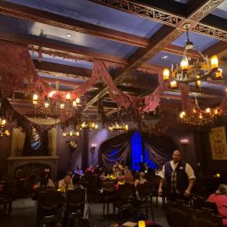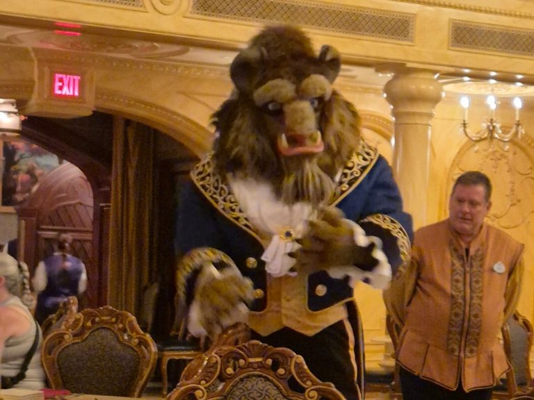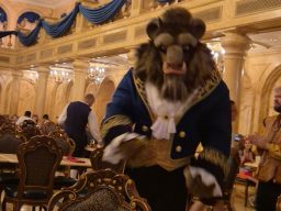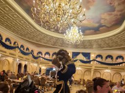 Pour me rendre dans les autres pièces, j'ai demandé si c'était possible à la fin du repas à notre serveur. Il m'a dit qu'il n'y avait aucun problème mais qu'il fallait faire attention à ne pas se retrouver sur le chemin de La Bête. Eh oui ! Tout au long du repas, la Bête vient nous faire un p'tit coucou toutes les 20 minutes. Attention, vous ne pouvez pas l'approcher ni prendre de photos avec. Elle a un chemin précis dans chaque salle mais ça reste une star qui est dure à côtoyer ! C'est un personnage rare, je ne l'avais jamais vu, j'ai donc été ravie. Notre table était proche de l'allée centrale, on était bien placé pour l'admirer. Elle est impressionnante. Les p'tits bémols : on ne peut pas prendre de photos avec et c'est le seul personnage qui apparaît. C'est dommage ! On le savait à l'avance et cela faisait parti des critiques que l'on avait lu sur le restaurant. On y est donc allé en connaissance de cause. Ça ne nous a pas empêchés de passer un très bon moment. Sans regrets ! La magie Disney a encore opéré.